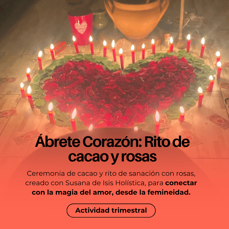Es una ceremonia de cacao y rito con rosas para trabajar la sanación emocional del corazón, el amor propio y la reconexión con la sensibilidad femenina.